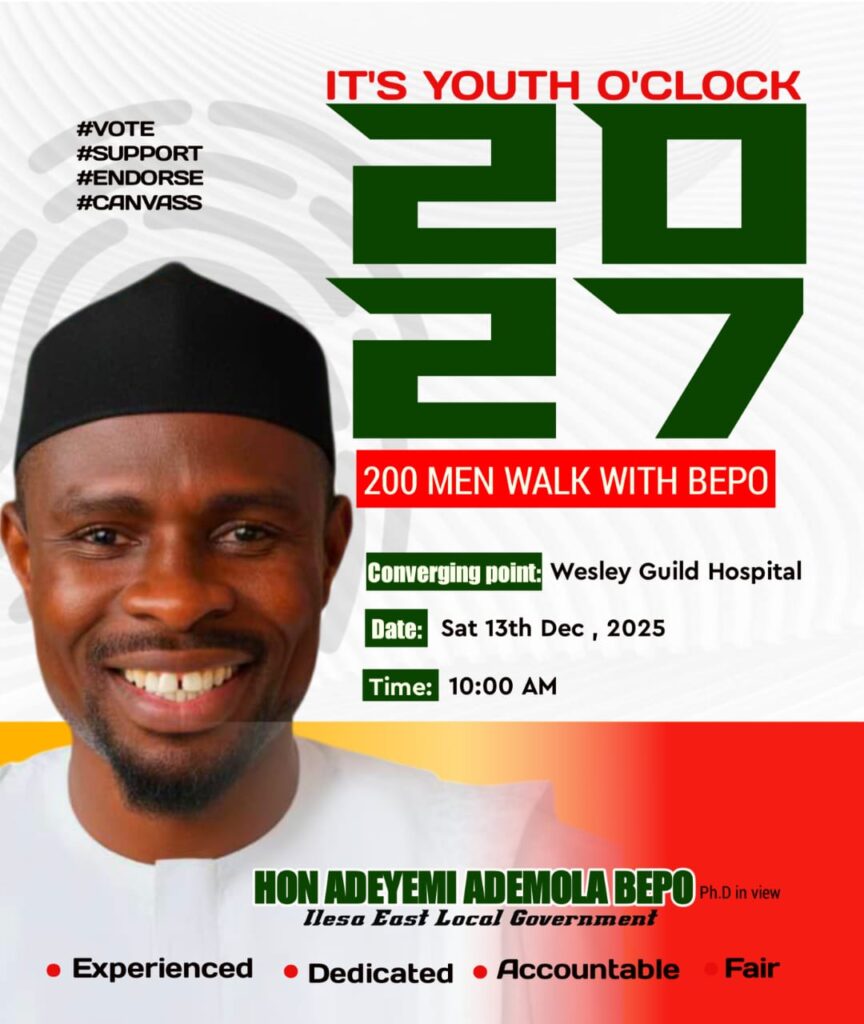 As we are preparing again for the 2027 general elections, Friends and Associates of BEPO has signified their interests to have the youthful Ijesa Prince on a ballot again, a vision that birthed Youth O’ clock movement to mark his birthday this year which started on Friday, 12th of December, 2025 at Hope 93.1FM, Ilesa with a program tagged: Campus Life, moderated by Comrade Joseph Oyelami – Super Blessing, a Nigerian Youth who is a pride of Ijesaland in the media industry. The Ijesa Prince utilized the platform to highlight his contributions to the education sector by giving scholarships to the indigent Students beyond Ijesaland, mentoring Students from secondary school level, and using politics as a tool to contribute to reviving the collapsing education sector of the country. “You cannot give what you don’t have, as a Mathematics Lecturer who actively participated in Students’ Unionism during my undergraduate days, as a home boy who was born and brought up in Isona area of Ilesa, as a Youth Leader and as a Mentor of many great Nigerian Youths, I know where the shoe pinches and that’s the major reason why my people are asking me to go back to the contest come year 2027” he said.