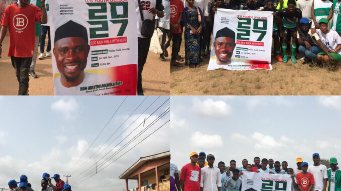 On Saturday, 13th of December, 2025 Youths from various areas of Ilesa East Local Government converged at Wesley Guild hospital gate, Ilesa for 200 Men walk with Honourable BEPO, the Youths started by paying homage to the Celebrant’s parents at their Isona residence before moving round some areas of Ilesa East Local Government and ended at C&S High School, Iyemogun road, Ilesa for the final match of the football competition organized in honour of the Celebrant.